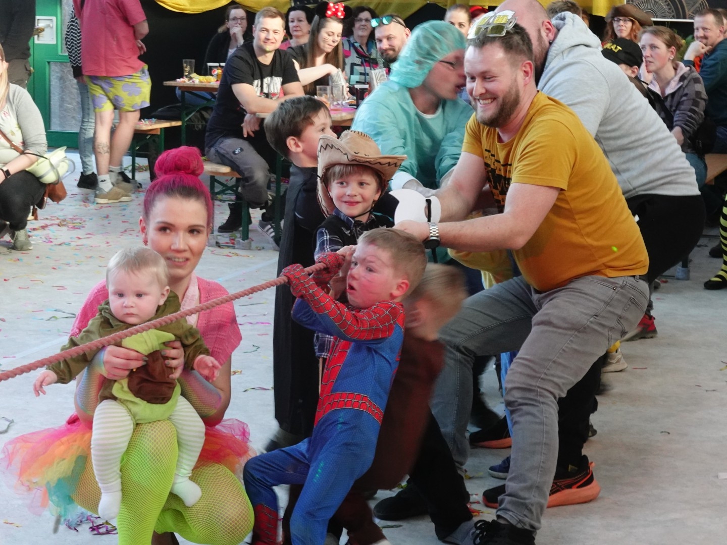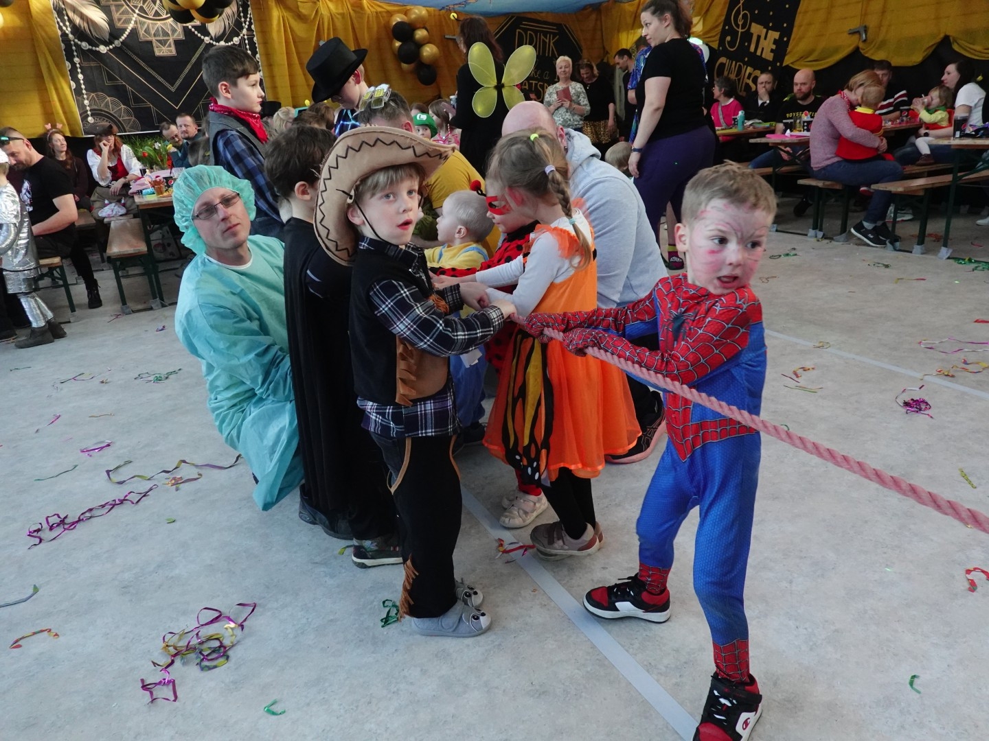 Der Kinderfasching bot wie stets den gewohnten Trubel mit Jung und Alt. Ausgelassen folgten die Kleinen den Animateuren bei der Saalpolonaise, Papierfliegerwerfen, Tauziehen und anderen fröhlichen Spielen – man sah nur vergnügte Gesichter in dieser bunten Faschingsgesellschaft.