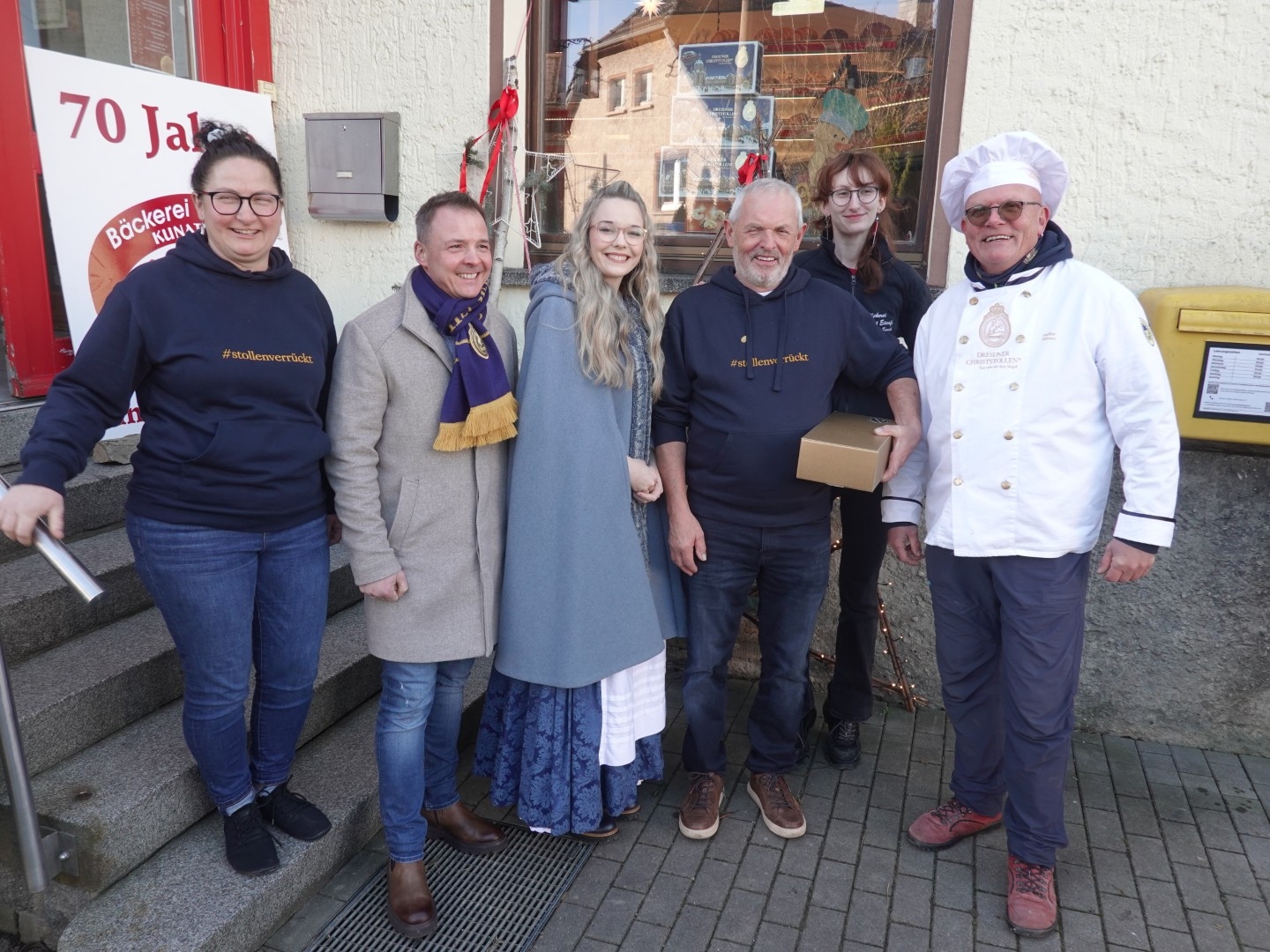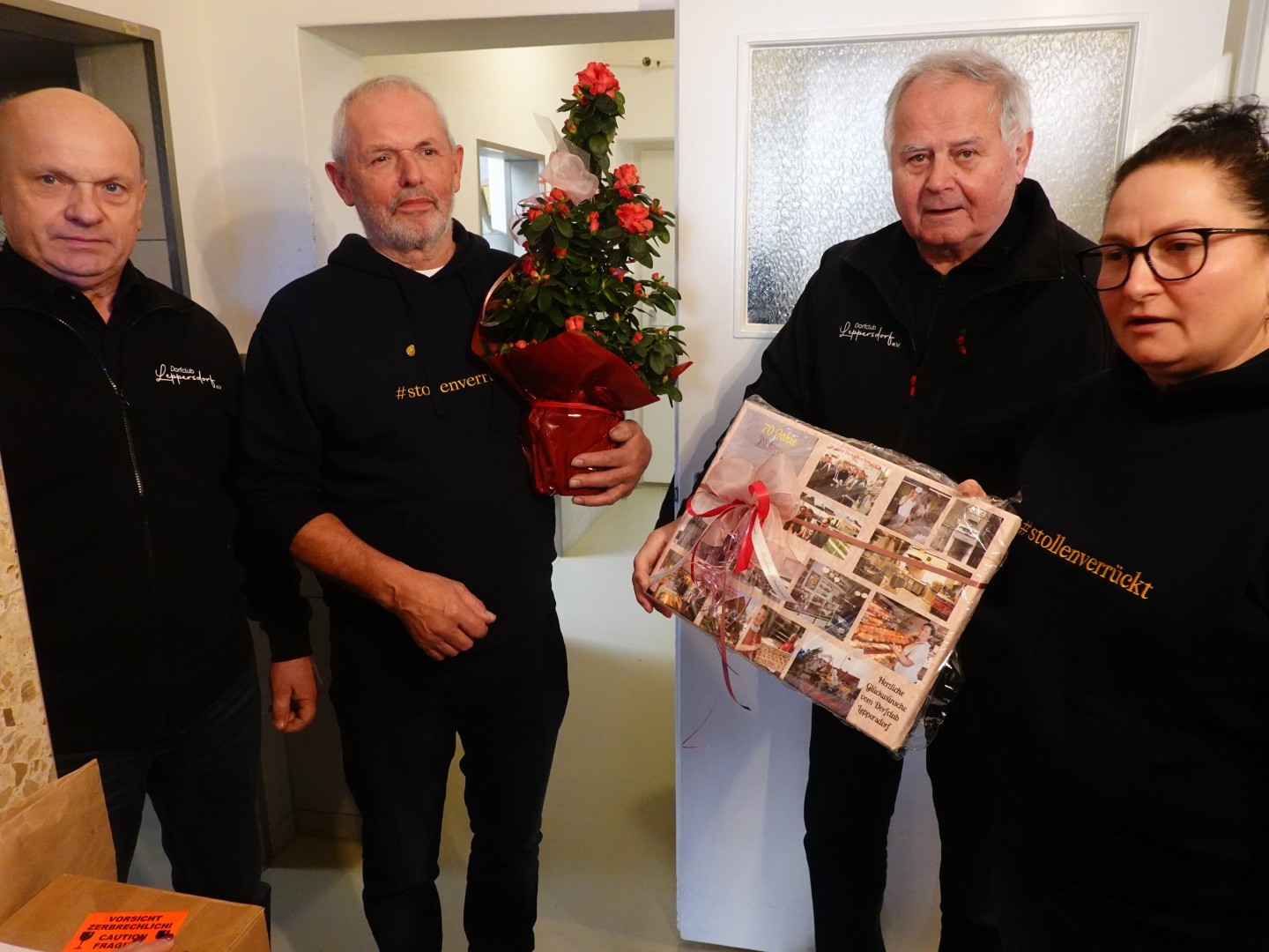 Zum 70-jährigen Bestehen der Bäckerei Kunath in Leppersdorf überbrachte eine kleine Delegation des Dorfclubs alle guten Wünsche und ein Präsent an Martin Kunath, selbst Mitglied des Dorfclubs, sowie an die Familienmitglieder und das gesamte Team der Bäckerei. Zuvor hatten die Kita-Kinder ein Ständchen vorgetragen. Auch Vertreter der Bäckerinnung, Berufskollegen und das Dresdner Stollenmädchen zollten ihren Kollegen in Leppersdorf ihren Respekt. Am Nachmittag setzte Ministerpräsident Kretschmer den Höhepunkt der Gratulationscour.