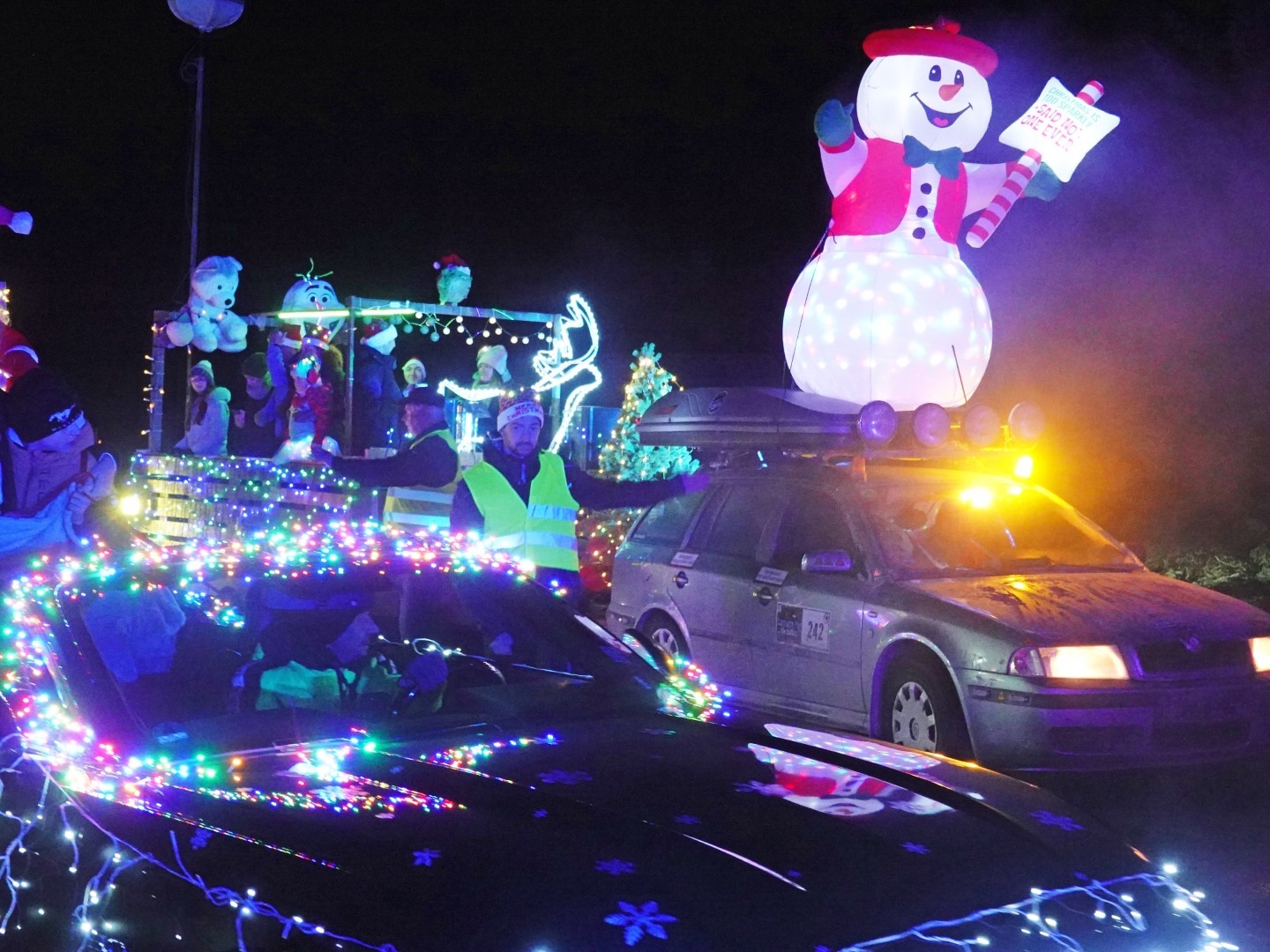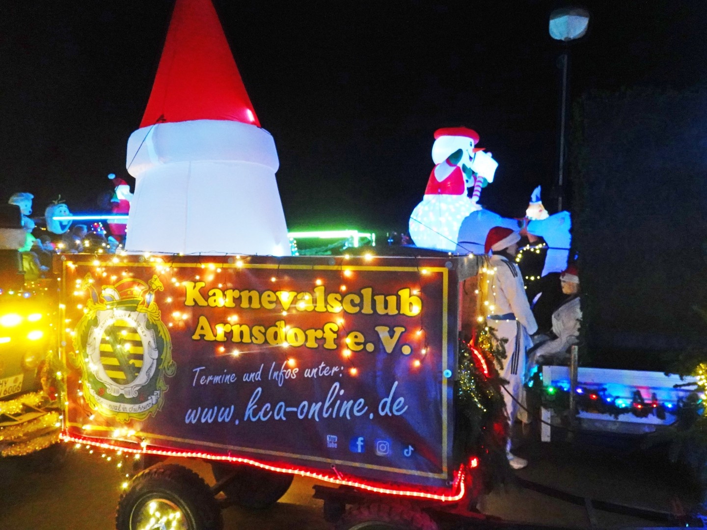 Ganze 70 geschmückte Fahrzeuge und „Fußläufige“ rückten zur diesjährigen Leppersdorfer Lichterfahrt an, so viele wie noch nie! – Einheimische und Neugierige aus den Nachbarorten eilten in Scharen herbei. Hervorzuheben vielleicht die originellen vier Eisbären und die „Weihnachtspolizei“. Gut vorbereitet meisterten der Dorfclub und die Freiwillige Feuerwehr minutiös den logistischen Ablauf des Geschehens auf der Festwiese und bei der Rundfahrt durch den Ort. Auch die eingespielten Teams an den Bratwurst-, Glühwein- und Verkaufsständen sowie die Beschallung durch DJ Ede funktionierten wie stets hervorragend. Nach dem Umzug durch die von zahlreichen Schaulustigen gesäumten Straßen fanden sich die Unentwegten noch zum „Nachglühen“ am Festplatzt ein. Wieder eine gelungene Einstimmung zum Weihnachtsfest. Dank allen Beteiligten und Helfern. Auf ein Neues!